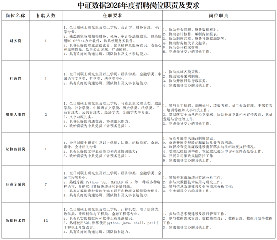 <b>中证数据有限责任公司2026年度招聘公告<br /><br />一、公司简介<br />中证数据有限责任公司(简称“中证数据”)成立于2012年9月,是中国证监会直接管理的下属专业机构,是我国资本市场的数据管理中心和业务分析中心。<br />中证数据承担证券期货业监管大数据中心的建设、运行和维护,负责数据采集、加工、汇总、存储、管理和治理;协助统筹中国证监会监管大数据分析需求,包括统计查询、风险监测、数据挖掘及其他监管应用;根据大数据分析需求,提出大数据监管应用系统和分析软件需求,按相关规定提交开发机构开发,并参与上线测试,负责验收;按照相关规定提供数据及分析等服务;承办中国证监会交办的其他工作。<br />根据业务发展需要,现面向海内外公开招募IT技术、经济金融、财务行政、组织人事、纪检监督等专业人员,欢迎有志于投身中国资本市场科技监管工作的优秀青年踊跃报名!<br />二、招聘对象<br />招聘对象为应届毕业生。其中境内院校毕业生应于2026年7月31日前取得相应学历学位证书,境外院校毕业生原则上应于2026年7月31日前取得相应的学历学位证书及教育部留学服务中心的学历学位认证。<br />三、招聘基本条件<br />1.具有中华人民共和国国籍;<br />2.拥护中华人民共和国宪法,拥护中国□□□的领导和中国特色社会主义制度;<br />3.具有硕士及以上学历和学位,留学归国人员应取得教育部学历学位认证;<br />4.具有良好的□□素质和道德品行;<br />5.具有正常履行职责的身体条件和心理素质;<br />6.热爱证券期货监管事业,事业心、责任感强,具备符合职位条件的工作能力等;<br />7.硕士研究生年龄原则上不超过27周岁(1998年1月1日及以后出生);博士研究生年龄原则上不超过30周岁(1995年1月1日及以后出生);<br />8.其他条件详见岗位具体要求。<br />四、招聘流程<br />本次招聘流程为:简历投递、资格审查、笔试、面试(两轮)、政审考察、体检、录用确认。<br />五、应聘方式<br />1.本次招聘仅接受在线报名申请,网申地址为:https://zhaopin.csdata.cn/zp.html<br />简历接收截止时间为2026年3月15日。<br />2.应聘方式:登录网申系统,按要求填写报名登记表(每人仅可投递一个职位)。<br />3.笔面试资格将通过短信、邮件等方式发送,请保持通讯畅通。<br />4.自简历投递截止日起,两周内未收到通知者视为未入围。<br />5.笔试预计将于3月下旬以线上与线下相结合的方式举行,其中线下笔试统一于北京举行,线上笔试仅限境外人员参加。<br />6.联系邮箱(zhaopin@csdata.cn),此邮箱仅接受招聘相关事宜咨询,不接收应聘简历。<br /><br />附件:中证数据2026年度招聘岗位职责及要求</b>